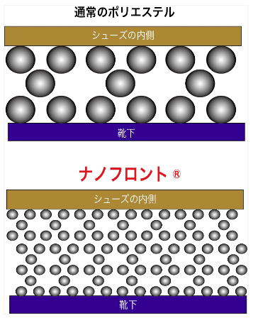 採用由 TEIJIN FRONTIER 公司全球首創的奈米纖維「NanoFront®」。這種被稱為超極細纖維的材料,其斷面面積僅為人類頭髮的 1/7500,纖維越細,與皮膚和鞋艙內的接觸點越多,產生極高的零位移貼合力。